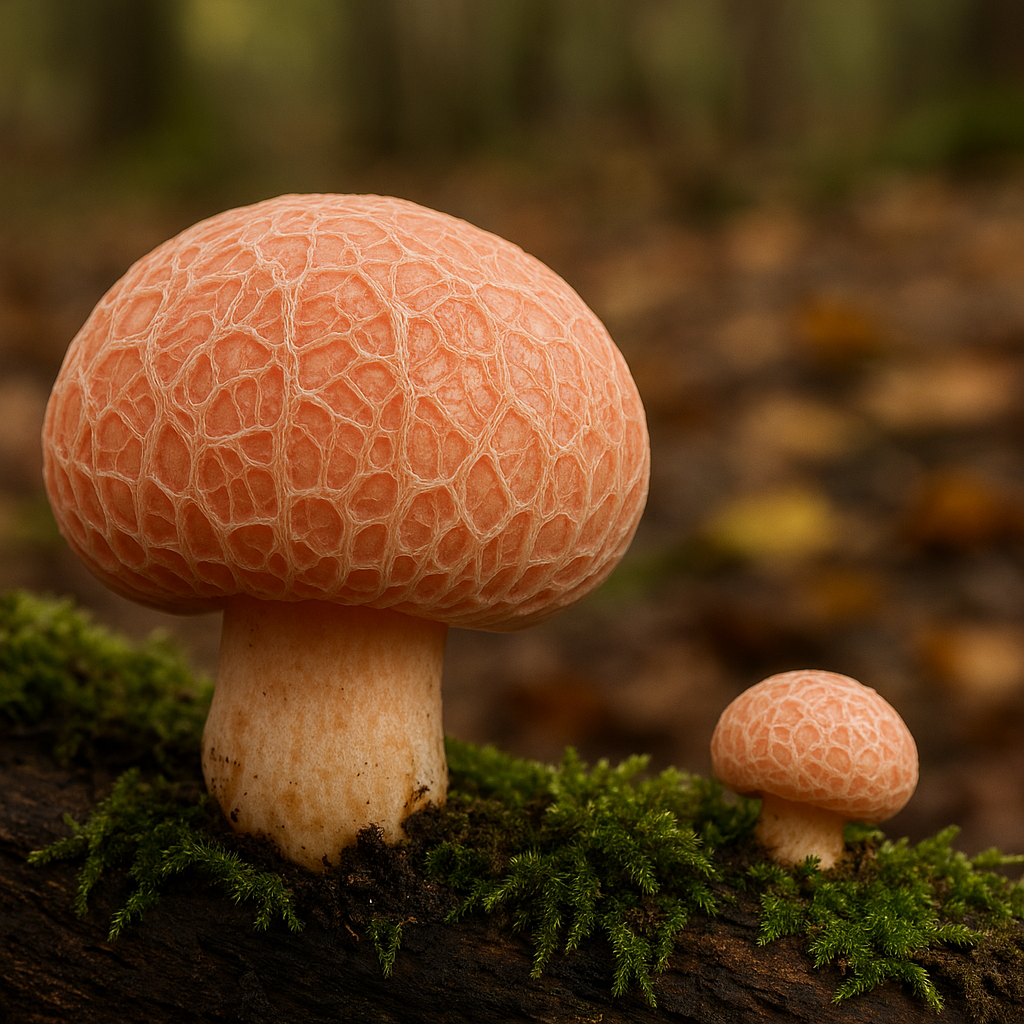 살구버섯의 가장 큰 특징은 색과 표면 구조다. 연한 살구빛에서 장밋빛을 띠는 갓 위로, 마치 그물이나 혈관처럼 보이는 망사 무늬가 뚜렷하게 나타난다. 이 패턴 덕분에 다른 버섯과 혼동될 가능성은 거의 없다.